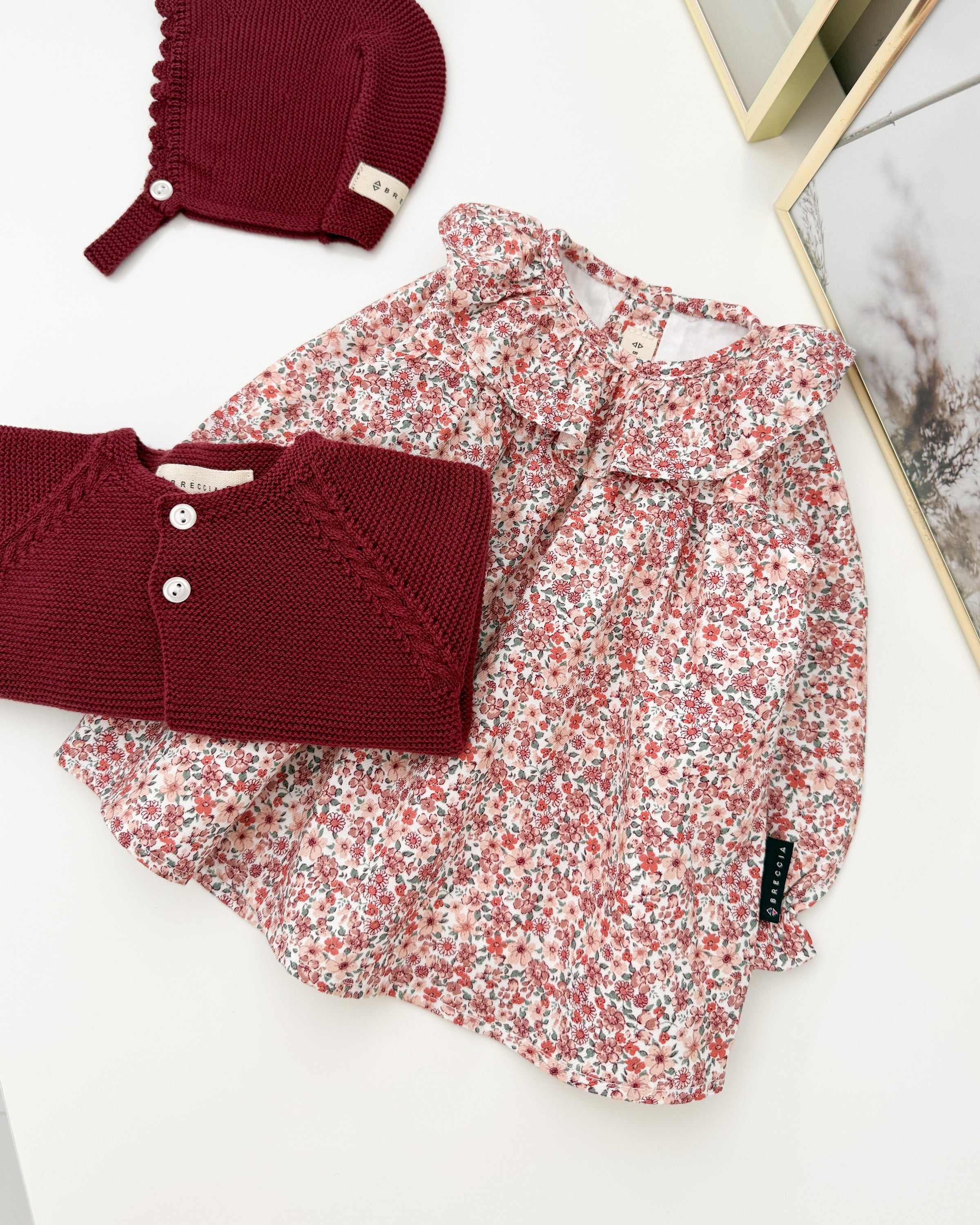 Descripción: vestido estampado a flores de manga larga terminado con cuello volante. Abotonado por la espalda y forrado en el interior.