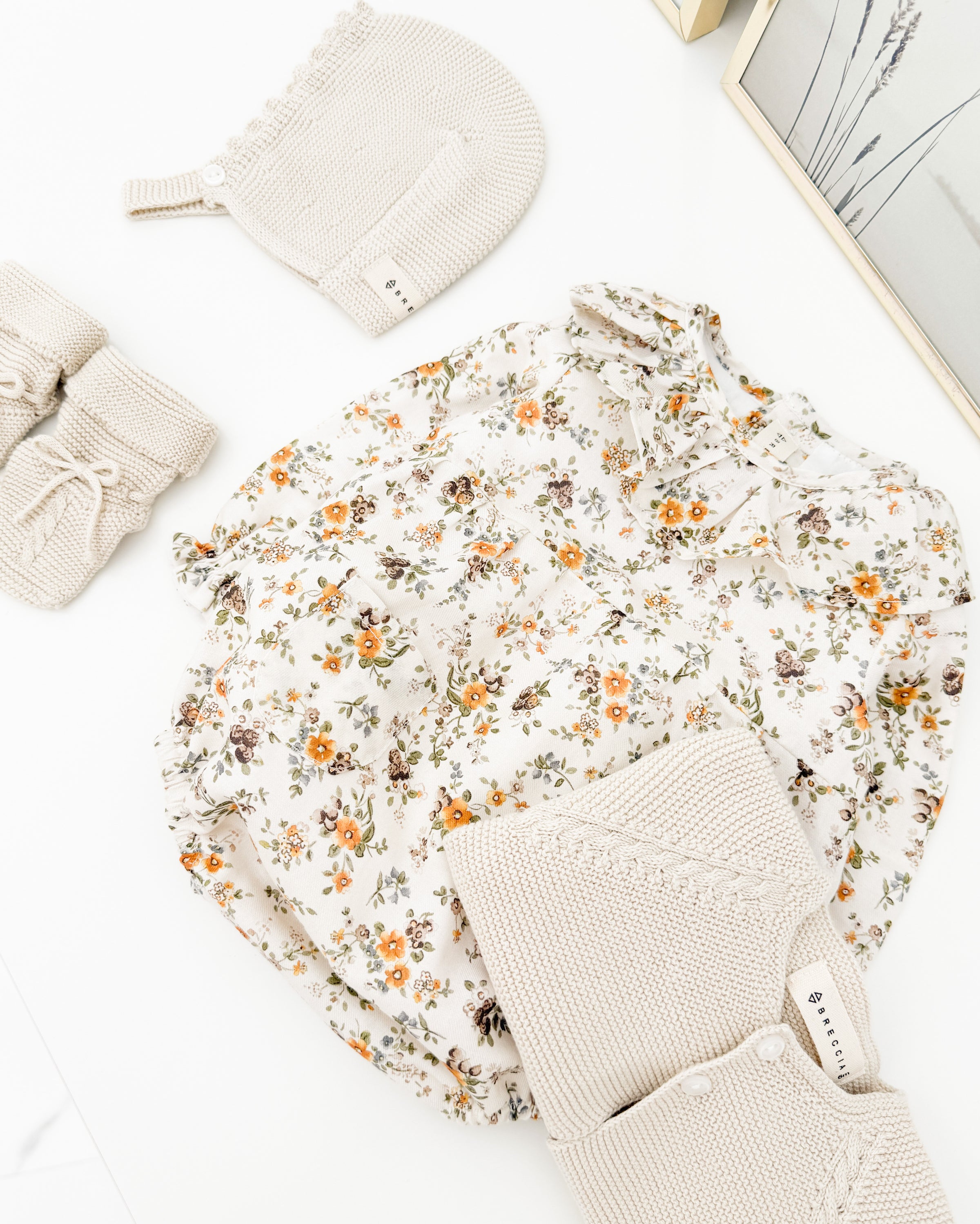 Descripción conjunto 2 prendas: Pelele vichy beige (60% Algodón - 40% Poliéster; Forro: 100% Algodón) y chaqueta de punto beige (100% algodón orgánico).